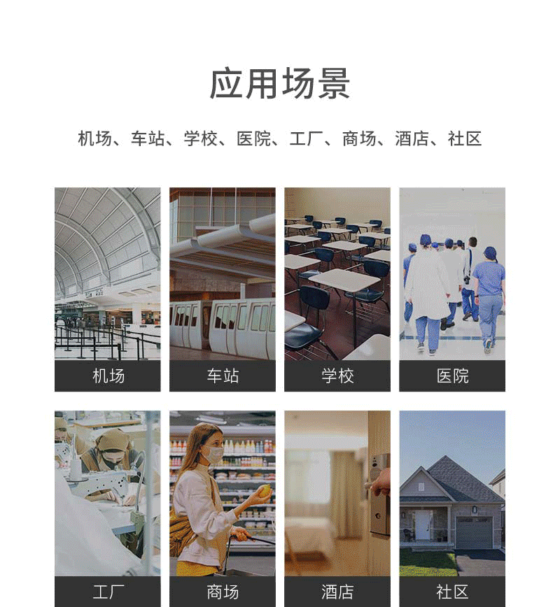 注意事項(xiàng) 紅外熱像告警系統(tǒng)應(yīng)正確安裝,可自動(dòng)跟蹤人體額頭區(qū)域并顯示體溫,操作人員應(yīng)經(jīng)生產(chǎn)廠家專(zhuān)業(yè)培訓(xùn),并嚴(yán)格按說(shuō)明書(shū)使用。 ·應(yīng)嚴(yán)格按照中國(guó)國(guó)標(biāo)(GB_T19146-2010)和各地市場(chǎng)監(jiān)管局的要求創(chuàng)造使用條件;·嚴(yán)格按照規(guī)范要求,安裝在室內(nèi)無(wú)風(fēng)或者微風(fēng)的固定位置使用,室溫環(huán)境在16°℃~32°C,避免陽(yáng)光、風(fēng)和其他熱源干擾(環(huán)境溫度超出16°℃~32°℃,需要安裝空調(diào),并在產(chǎn)品3m內(nèi)無(wú)風(fēng)或者微風(fēng)); ·若安裝在室外,必須搭建棚子或者板房來(lái)保證環(huán)境穩(wěn)定; ·戶(hù)外陽(yáng)光照射后、劇烈運(yùn)動(dòng)后或從溫差較大的戶(hù)外場(chǎng)景進(jìn)入室內(nèi),需在室內(nèi)環(huán)境平靜靜置5分鐘后進(jìn)行測(cè)試。