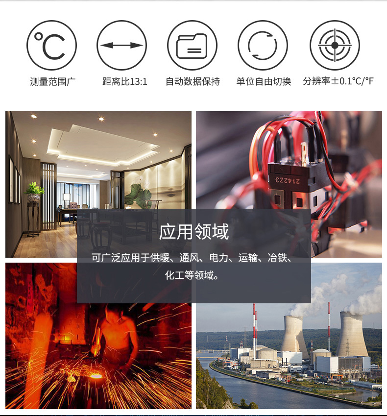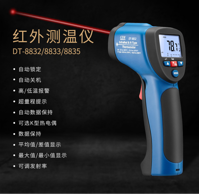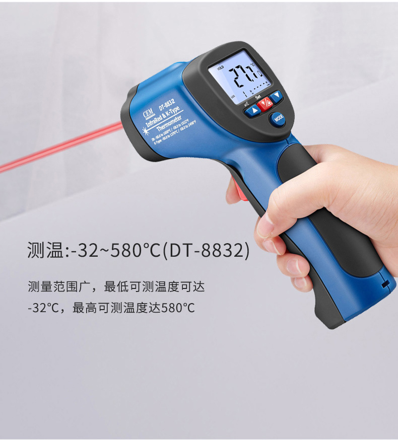華盛昌DT-8832二合一紅外線測溫儀屬于紅外測溫儀,鋌和華盛昌CEM品牌專區(qū)提供詳細的華盛昌DT-8832二合一紅外線測溫儀介紹,包括華盛昌DT-8832二合一紅外線測溫儀價格、基本參數、產品特點、華盛昌DT-8832二合一紅外線測溫儀圖片、功能及適用范圍等信息,還有華盛昌DT-8832二合一紅外線測溫儀問答及用戶評價為您選購提供全方位的參考。想了解更多更全的華盛昌CEM紅外測溫儀報價、型號、種類以及使用方法相關內容,可以到華盛昌CEM品牌專區(qū)。 華盛昌DT-8832二合一紅外線測溫儀是紅外測溫和K型溫度測溫結合的二合一紅外線測溫儀 雙注塑機殼、1米防摔,高達30:1的距離比 帶K型熱點偶測溫,可以根據您的需要適應不同場合的測溫要求。 溫度段從380℃至1050℃滿足測溫場景 ℃/℉溫度單位轉換 可達±1.5%測量精度 自動數據保持 20個數據儲存 最大值/最小值顯示 K型熱電偶測溫(量程設計-50℃至1370℃) 超亮背光LCD顯示,在暗處也可以輕易測量和讀數 自動獲取目標的可調發(fā)射率,可測量不同材質的物體表面溫度 距離比D:S=16:1,30:1供選擇,高距離比可遠距離測量更小尺寸目標