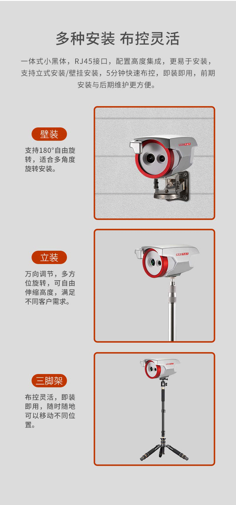 注意事項 紅外熱像告警系統(tǒng)應(yīng)正確安裝,可自動跟蹤人體額頭區(qū)域并顯示體溫,操作人員應(yīng)經(jīng)生產(chǎn)廠家專業(yè)培訓(xùn),并嚴(yán)格按說明書使用。 ·應(yīng)嚴(yán)格按照中國國標(biāo)(GB_T19146-2010)和各地市場監(jiān)管局的要求創(chuàng)造使用條件;﹒嚴(yán)格按照規(guī)范要求,安裝在室內(nèi)無風(fēng)或者微風(fēng)的固定位置使用,室溫環(huán)境在16°℃~32℃,避免陽光、風(fēng)和其他熱源干擾(環(huán)境溫度超出16°℃~32°℃,需要安裝空調(diào),并在產(chǎn)品3m內(nèi)無風(fēng)或者微風(fēng)); ·若安裝在室外,必須搭建棚子或者板房來保證環(huán)境穩(wěn)定; ·戶外陽光照射后、劇烈運動后或從溫差較大的戶外場景進入室內(nèi),需在室內(nèi)環(huán)境平靜靜置5分鐘后進行測試。