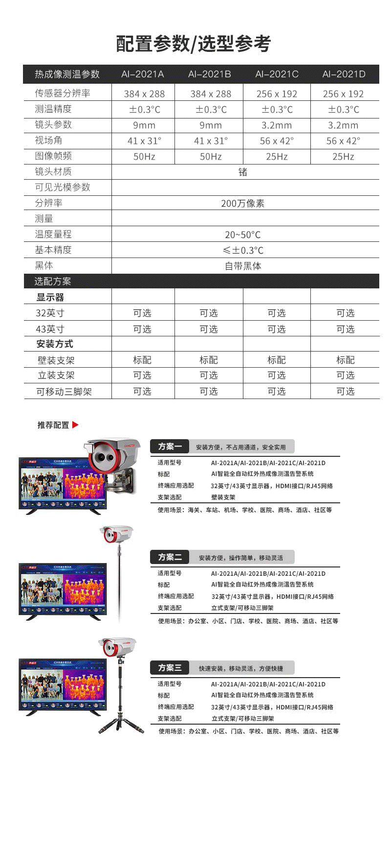 2安裝與維護 2-1,紅外熱像告警系統(tǒng)部署原則 Al-2021紅外熱像告警系統(tǒng)屬于精密測溫和成像設(shè)備,對部署應(yīng)用有一定要求,注意事項如下: ·安裝環(huán)境:設(shè)備機頭所處位置需光線良好(照明度≥10OLux),應(yīng)避免處于逆光的位置;設(shè)備機頭布置位置附近3米范圍內(nèi)不應(yīng)有空調(diào)出風(fēng)口;設(shè)備機頭所監(jiān)控的視場內(nèi),不能受到光照、西曬等外界強熱源的干擾; ·機頭布置:合理布置A-2021機頭的位置,向下俯視角度為13°~15°;合理布局人員檢測位置和范圍,AI-2021機頭的攝像頭距離被測人員的額頭的位置為1.0~5.0米,最佳測試位置為2.0米;