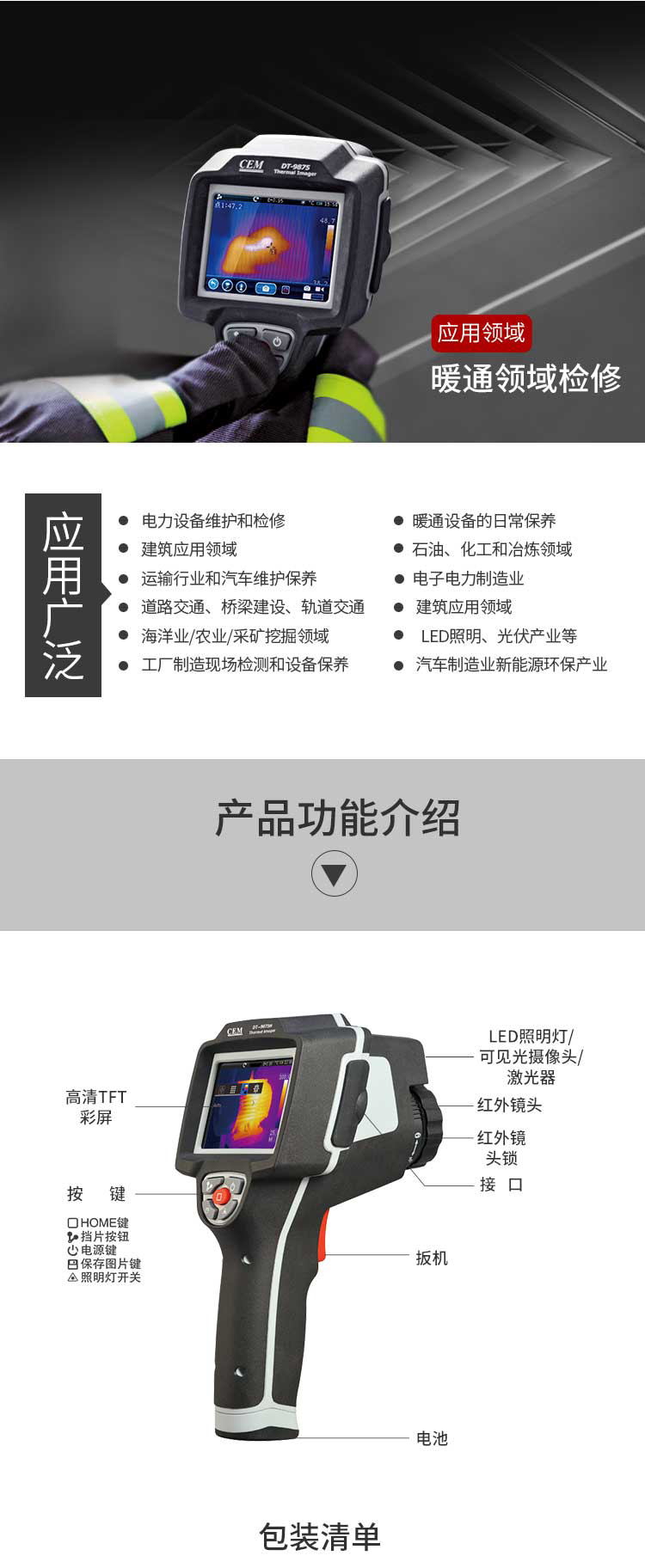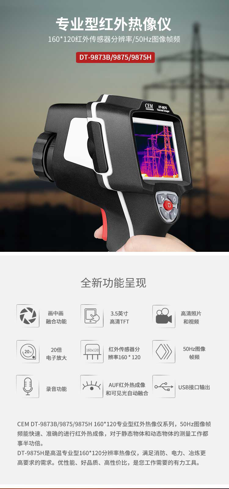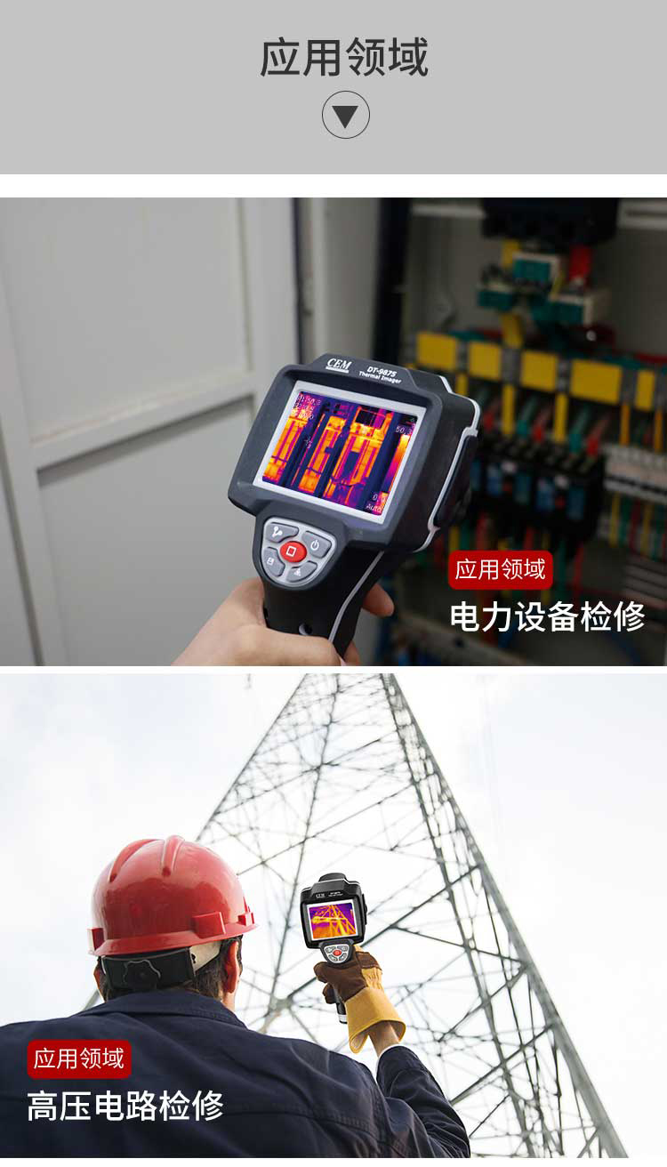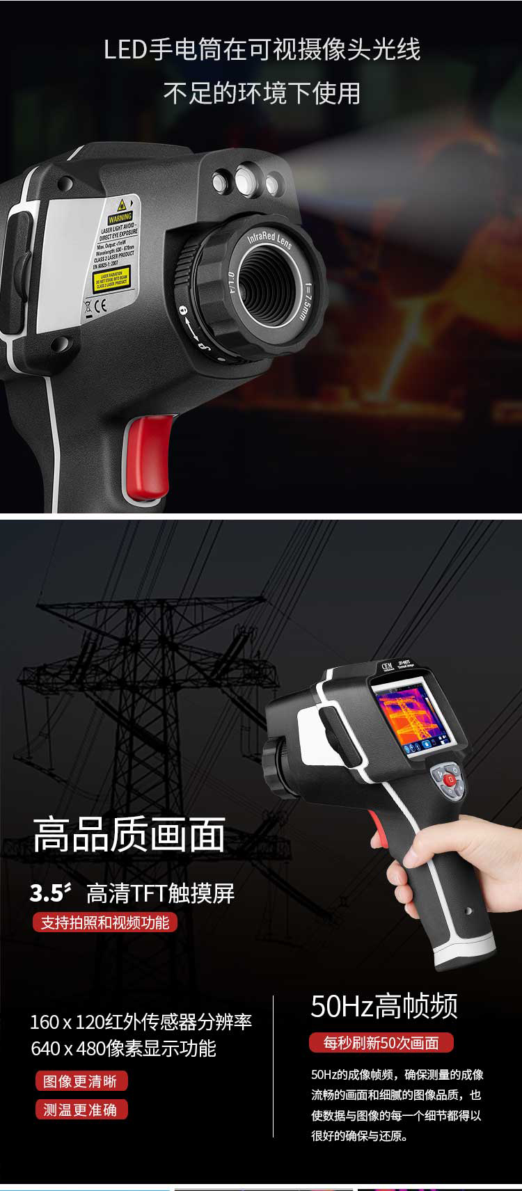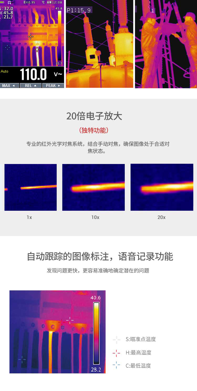 標配鏡頭7.5mm,分辨率160×120,IFOV:3.33mard,視場角29.8×22.6°,熱靈敏度NETD<0.08℃,圖像幀頻50Hz,溫度范圍(-20-800),可見光分辨率640×480像素