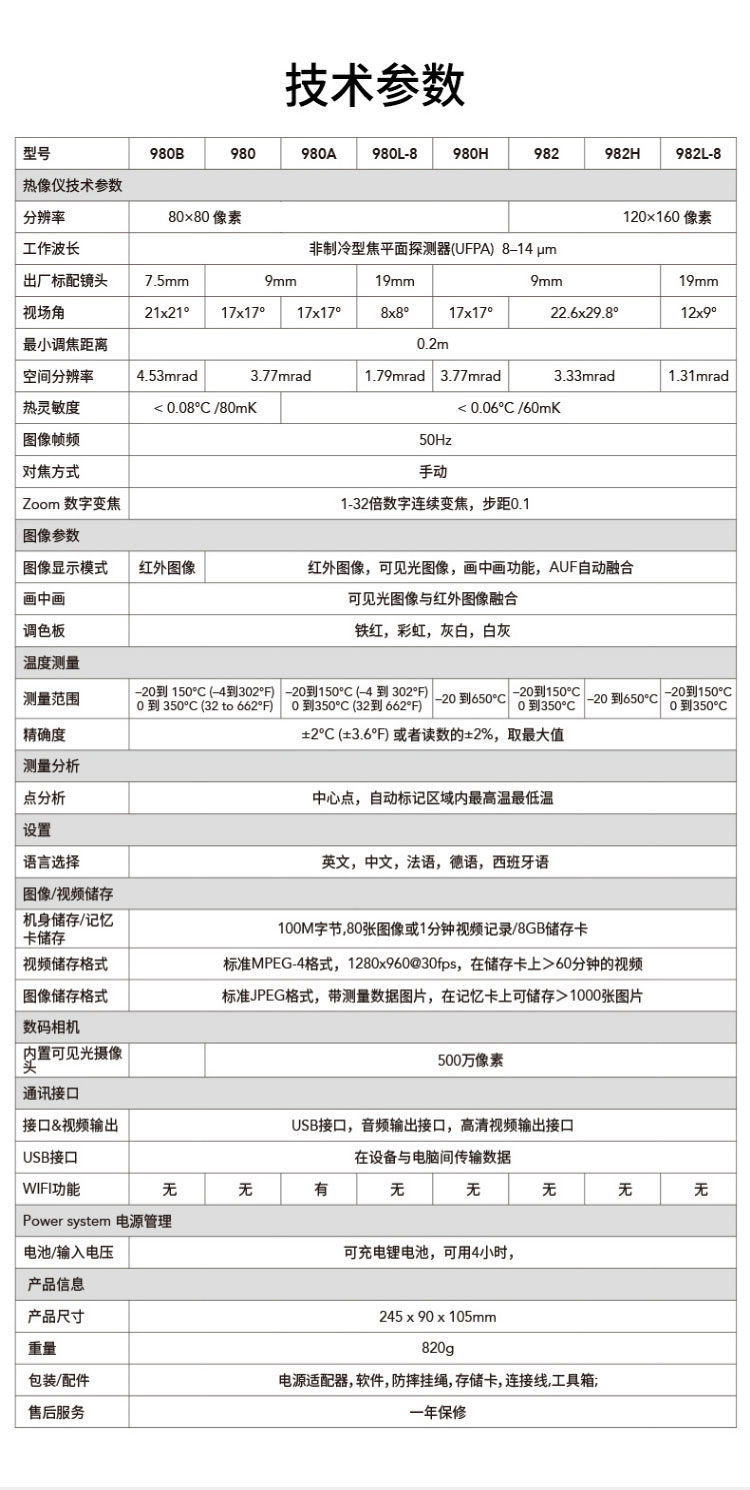 標(biāo)配鏡頭19mm,分辨率160×120,IFOV:1.79mard,視場(chǎng)角8×8°,熱靈敏度NETD<0.06℃,圖像幀頻50Hz,溫度范圍(-20-150、0-350),可見(jiàn)光分辨率500萬(wàn)像素